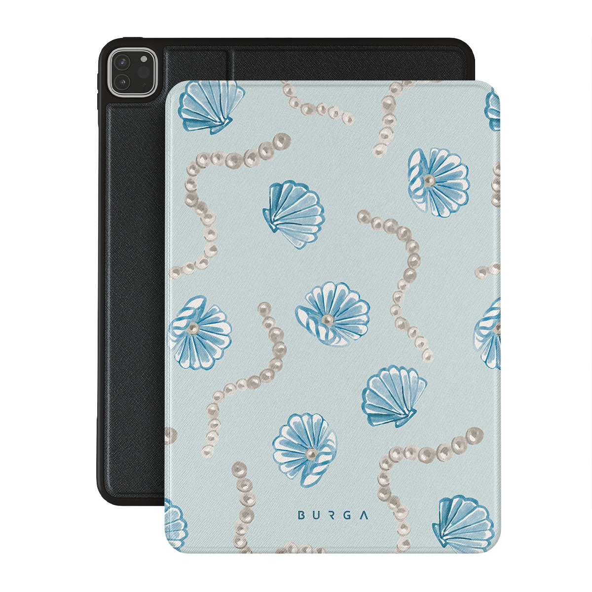 En este diseño: perlas, conchas, fondo azul claro, elementos del mar.
