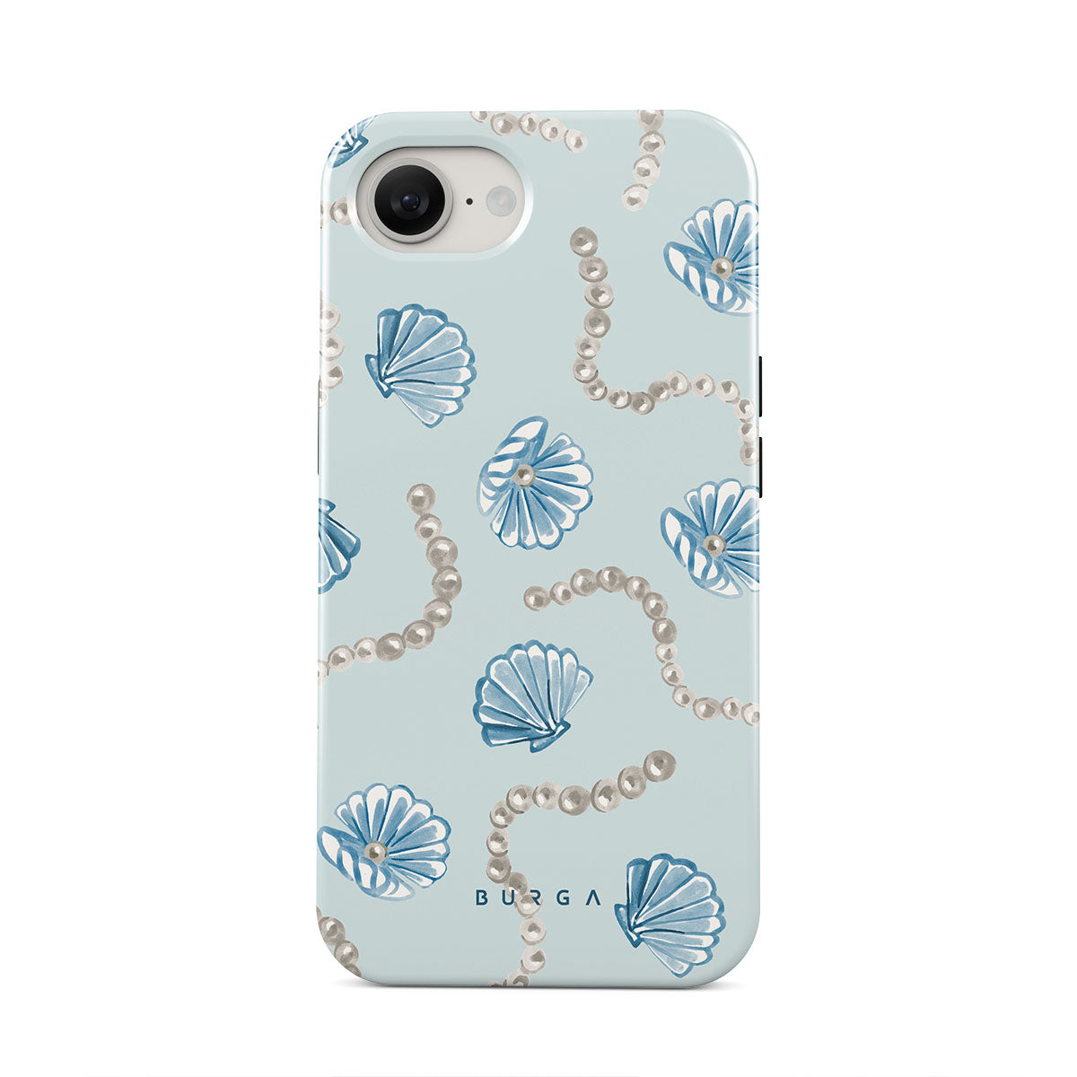 En este diseño: perlas, conchas, fondo azul claro, elementos del mar.