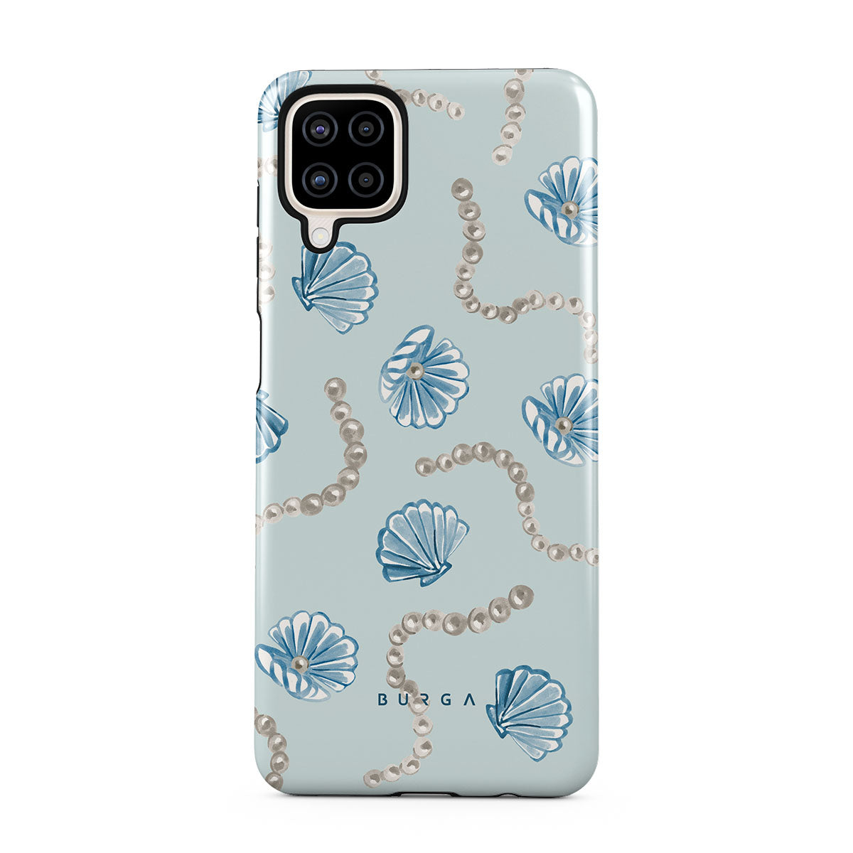 En este diseño: perlas, conchas, fondo azul claro, elementos del mar.