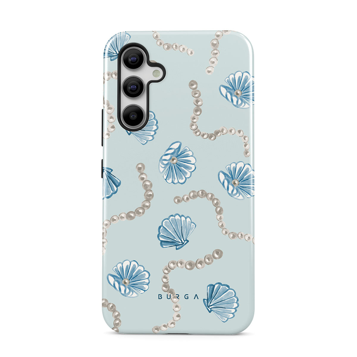 En este diseño: perlas, conchas, fondo azul claro, elementos del mar.