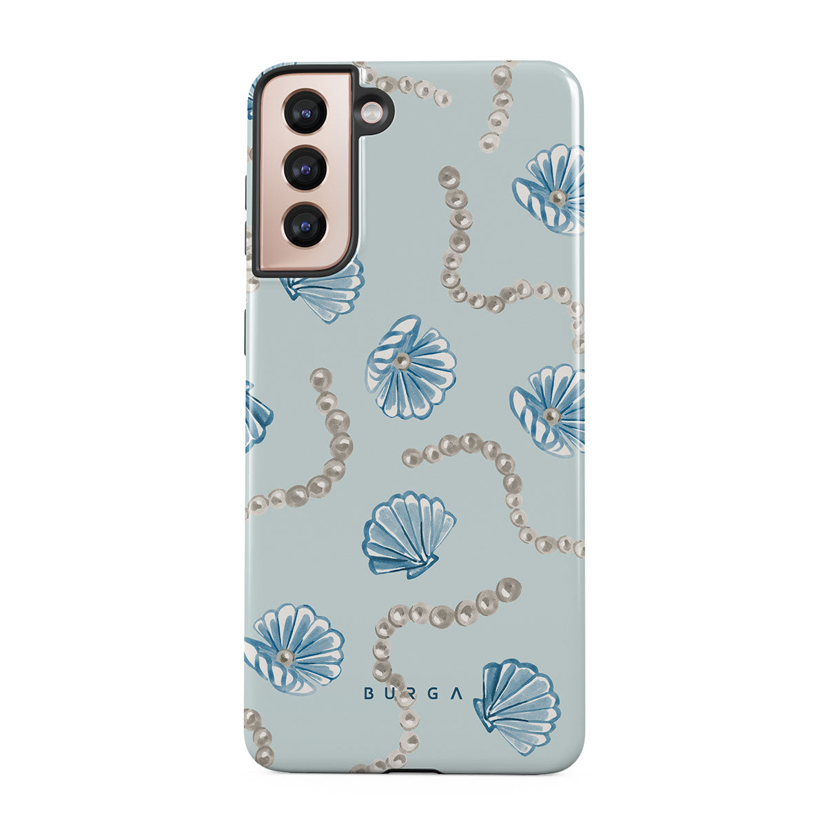 En este diseño: perlas, conchas, fondo azul claro, elementos del mar.