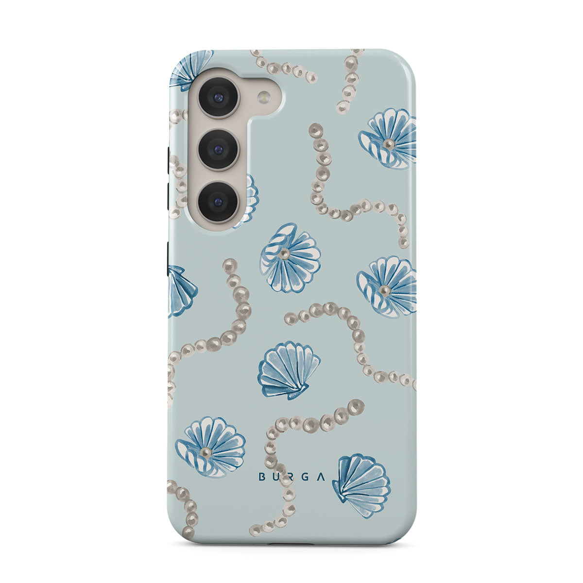En este diseño: perlas, conchas, fondo azul claro, elementos del mar.