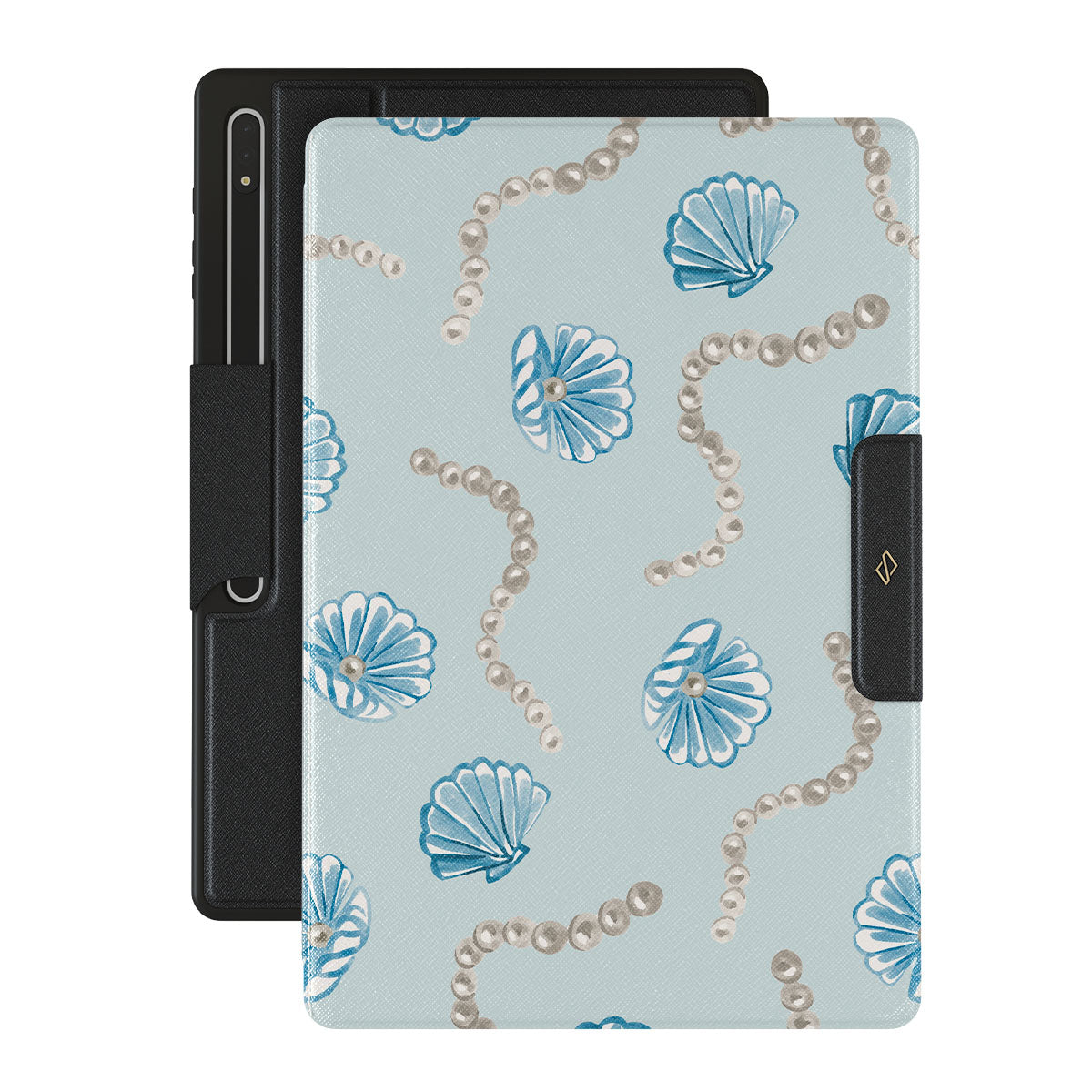 En este diseño: perlas, conchas, fondo azul claro, elementos del mar.