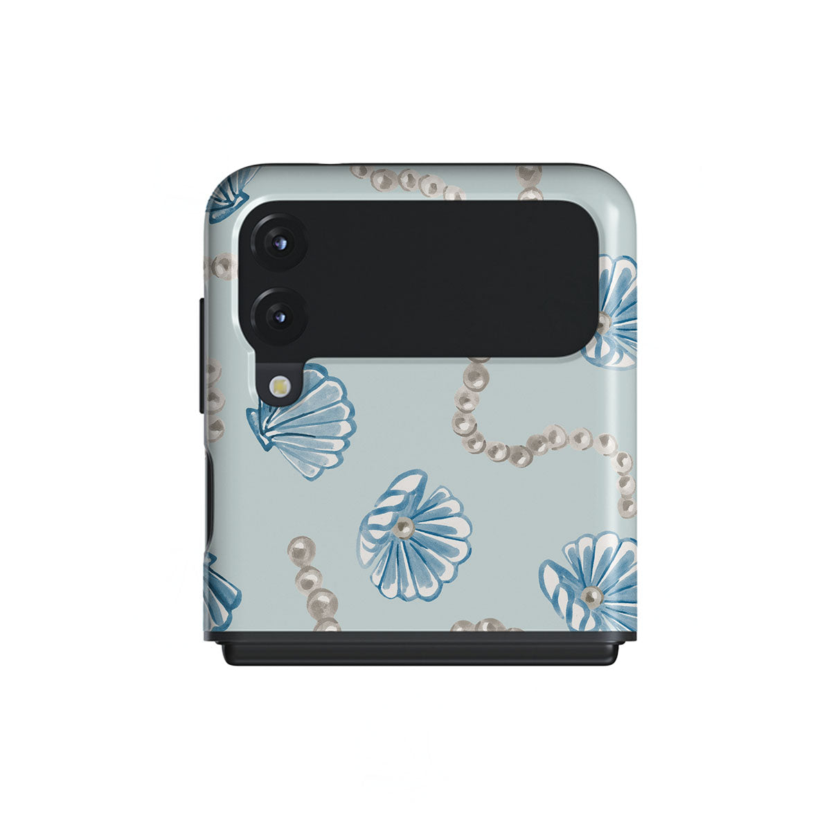 En este diseño: perlas, conchas, fondo azul claro, elementos del mar.