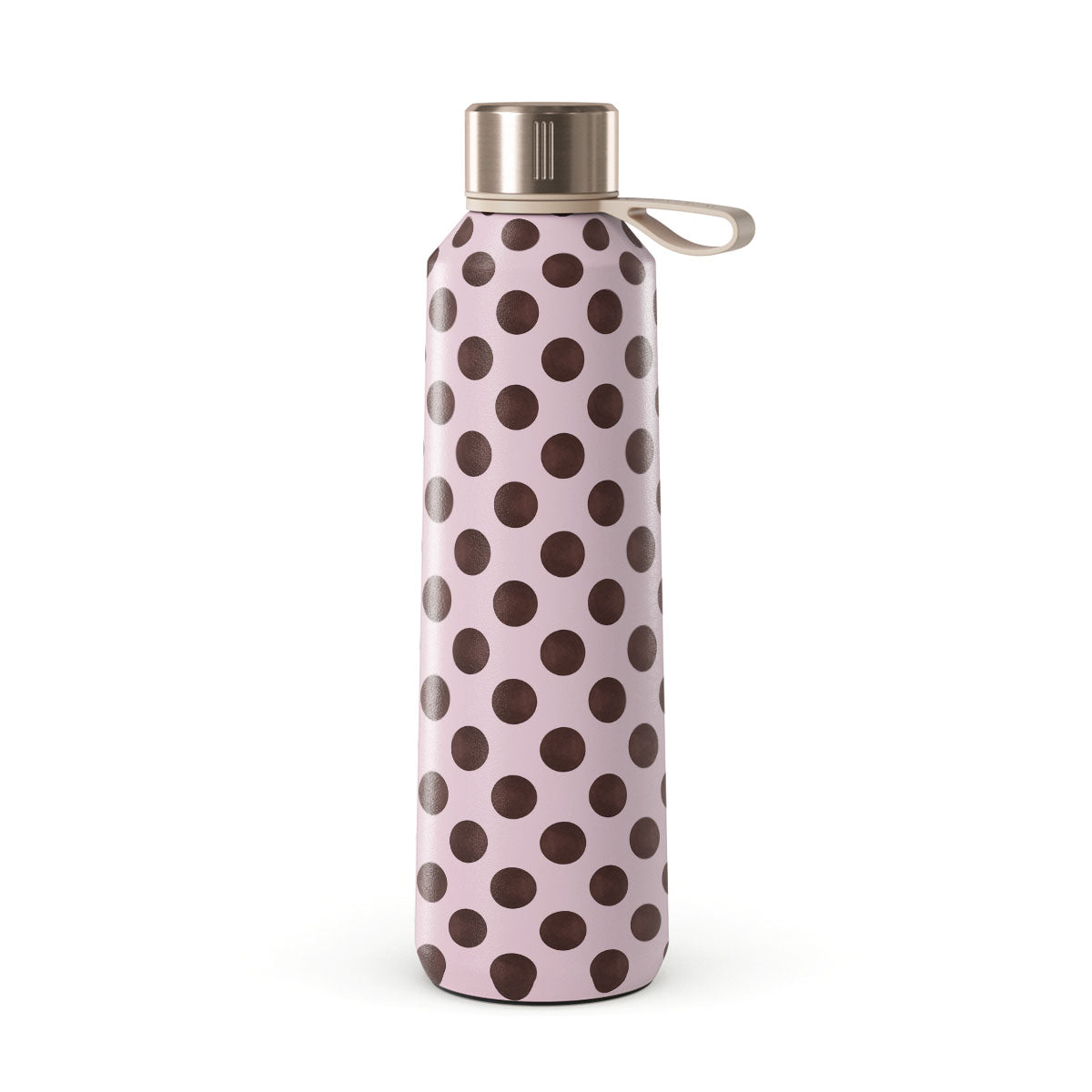En este diseño: un patrón retro de lunares, fondo rosa con lunares marrones.