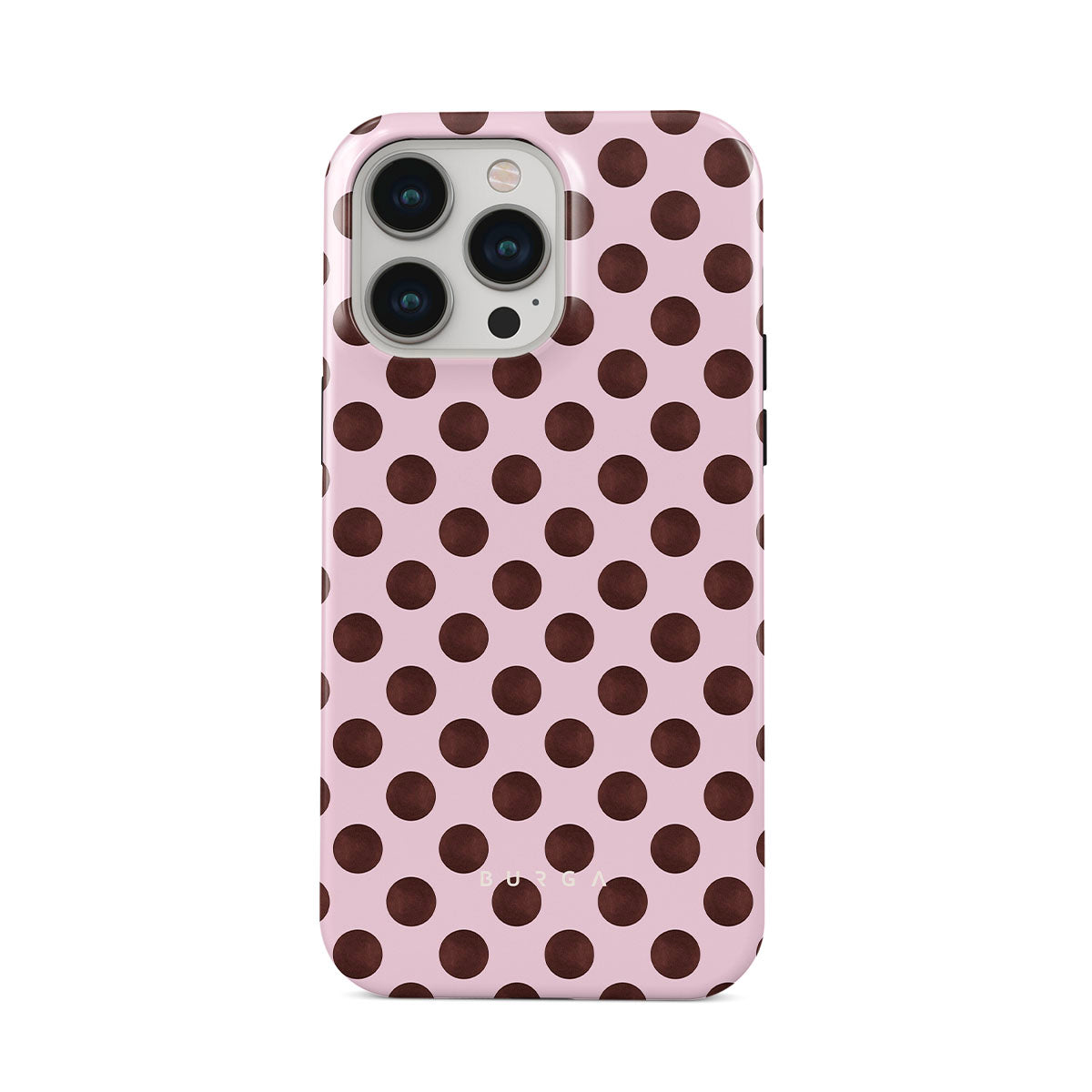 En este diseño: un patrón retro de lunares, fondo rosa con lunares marrones.