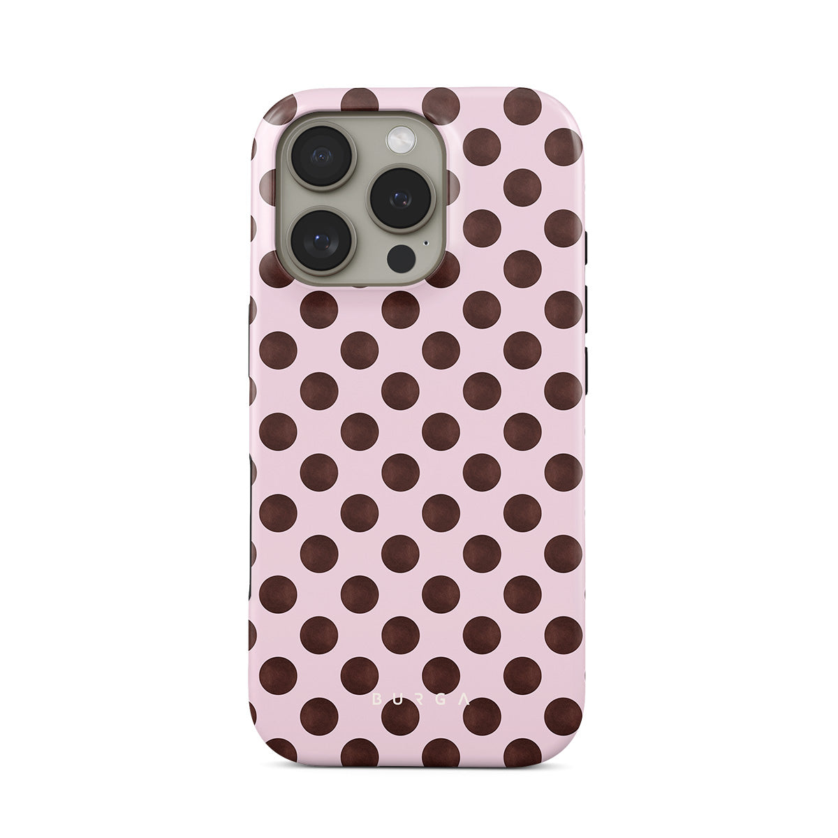 En este diseño: un patrón retro de lunares, fondo rosa con lunares marrones.