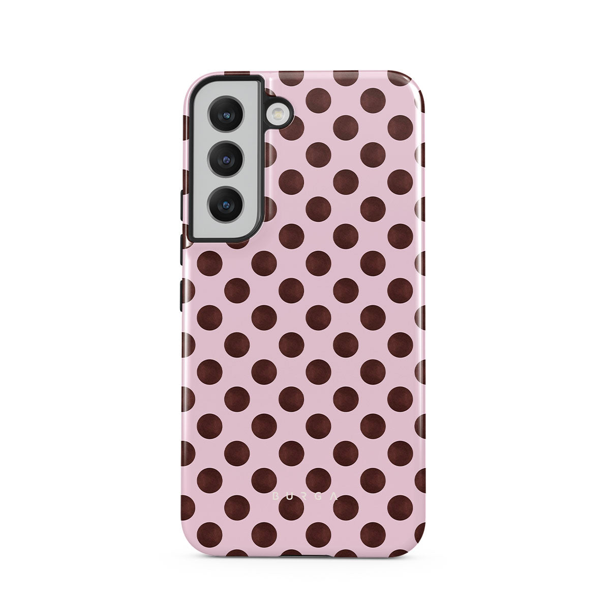 En este diseño: un patrón retro de lunares, fondo rosa con lunares marrones.