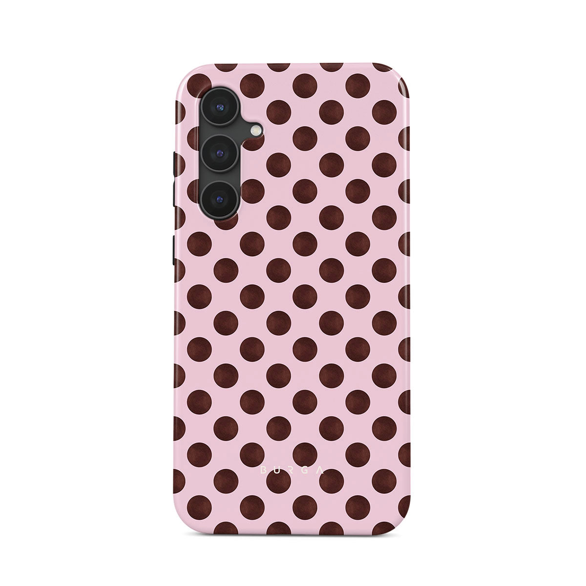 En este diseño: un patrón retro de lunares, fondo rosa con lunares marrones.