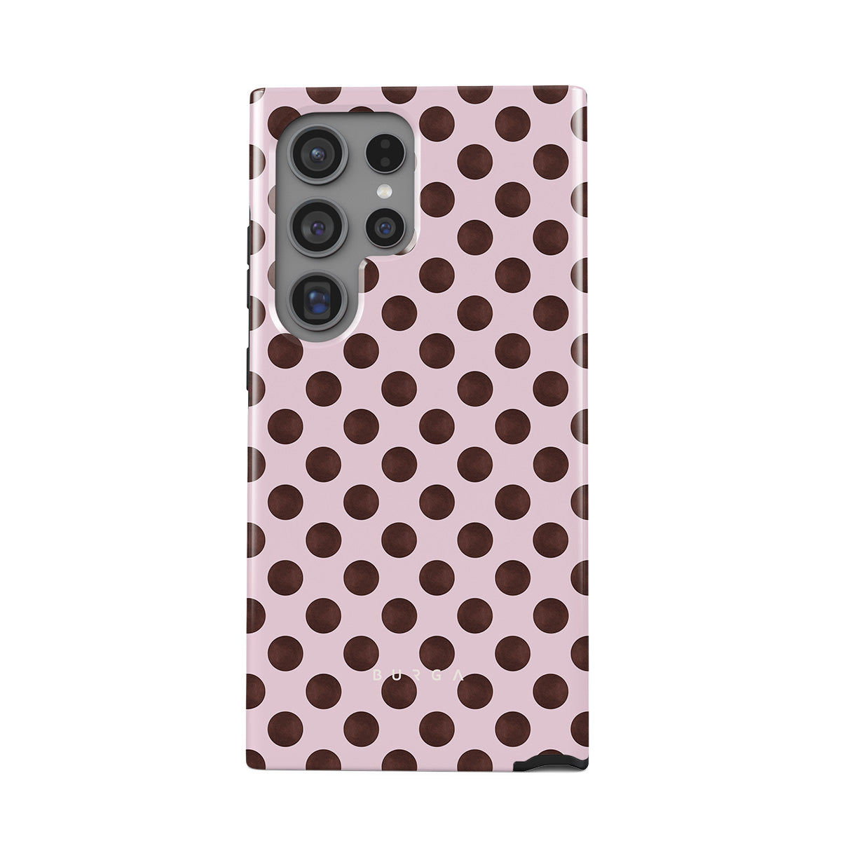 En este diseño: un patrón retro de lunares, fondo rosa con lunares marrones.