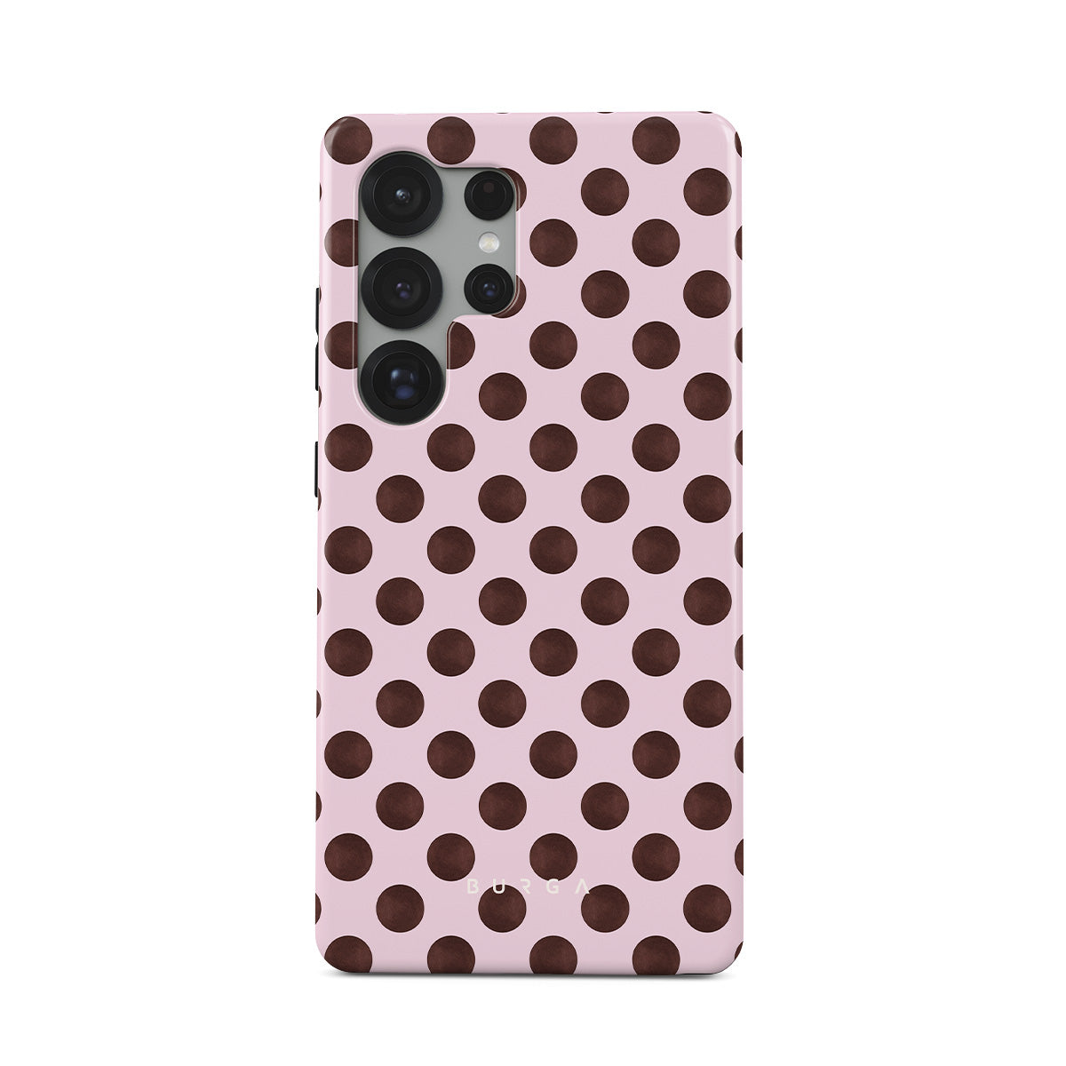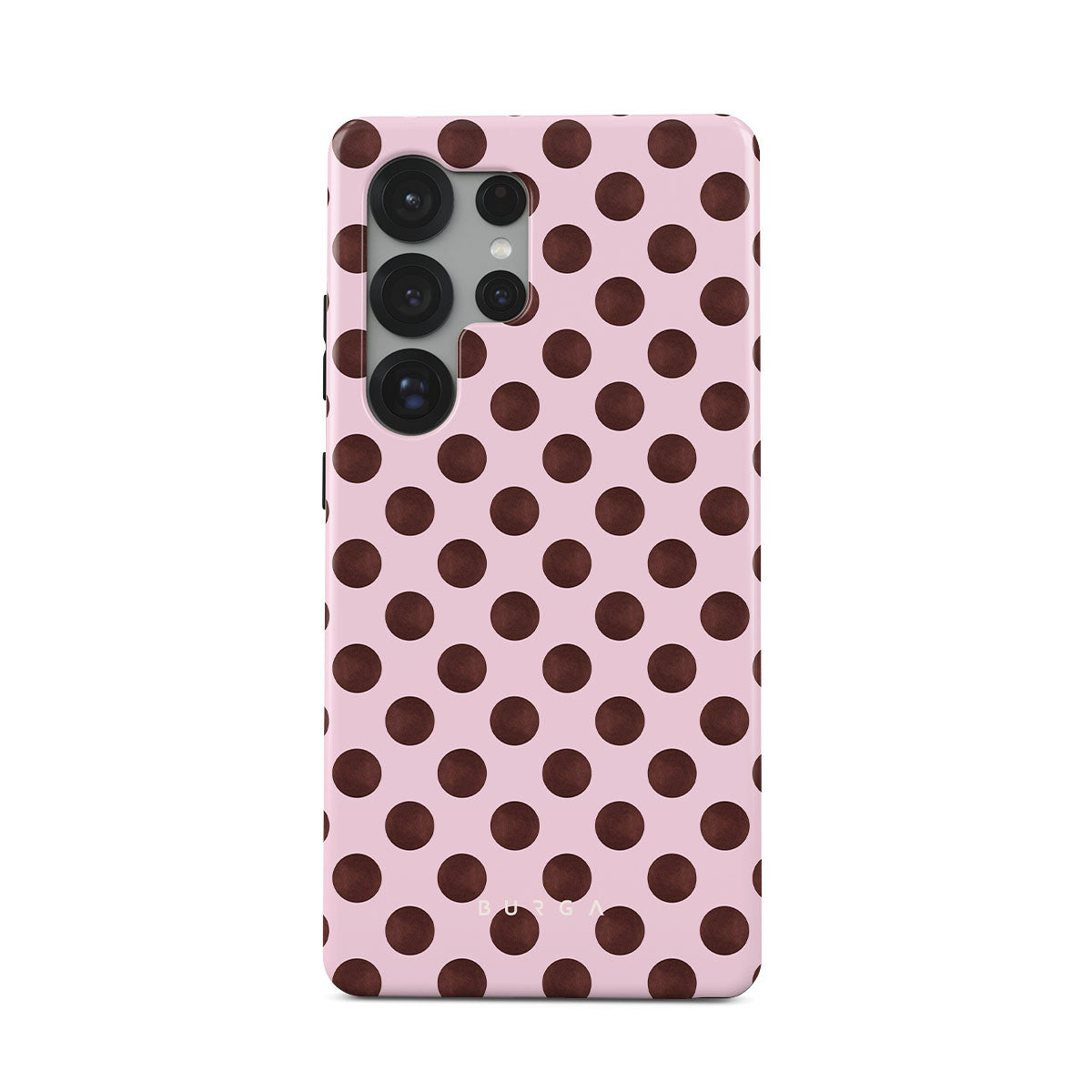 En este diseño: un patrón retro de lunares, fondo rosa con lunares marrones.