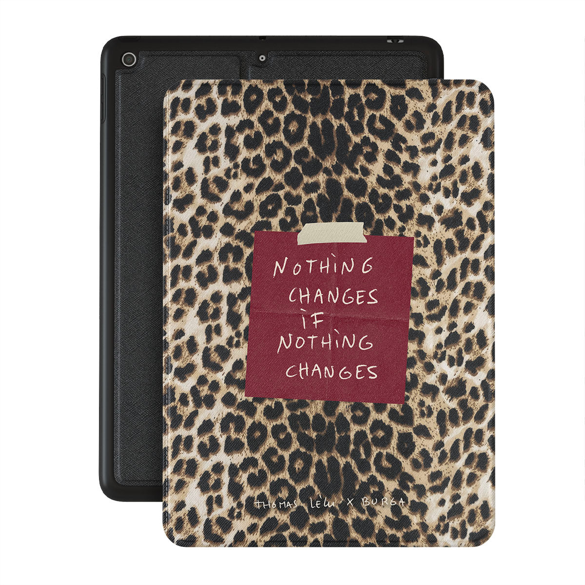En este diseño: una cita en letra cursiva, una nota adhesiva roja, estampado animal