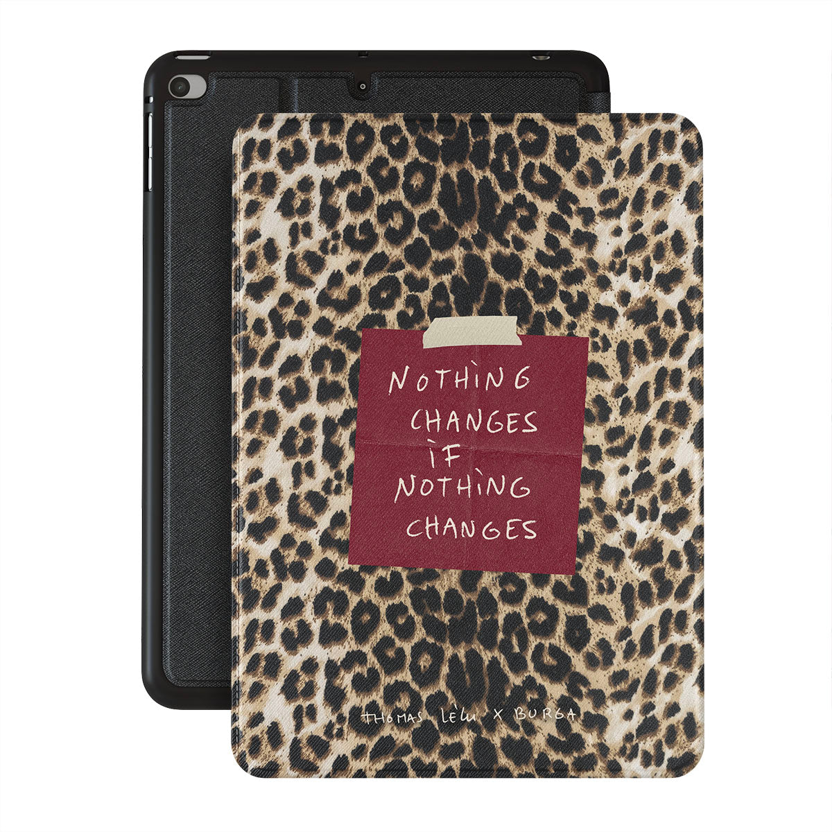 En este diseño: una cita en letra cursiva, una nota adhesiva roja, estampado animal