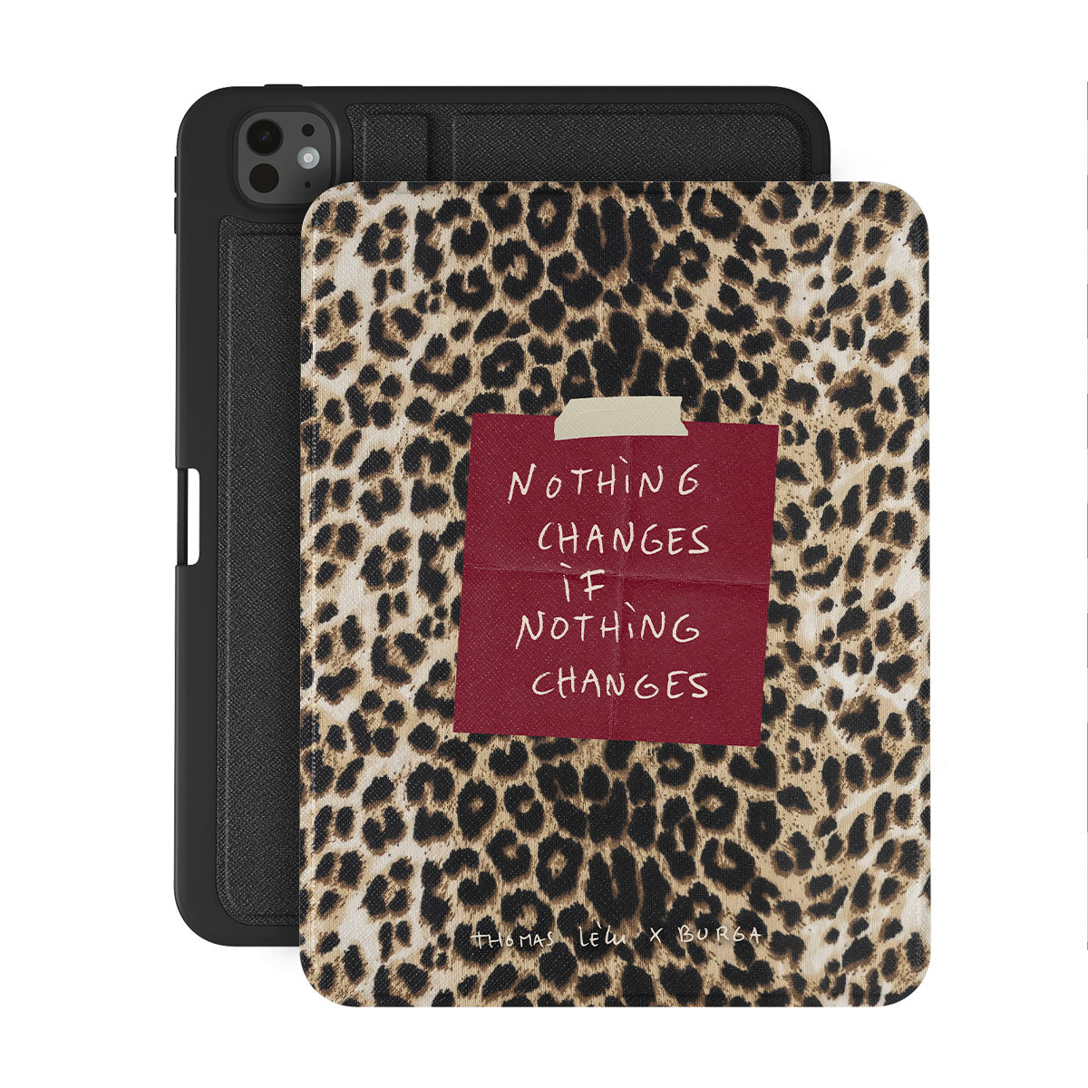 En este diseño: una cita en letra cursiva, una nota adhesiva roja, estampado animal