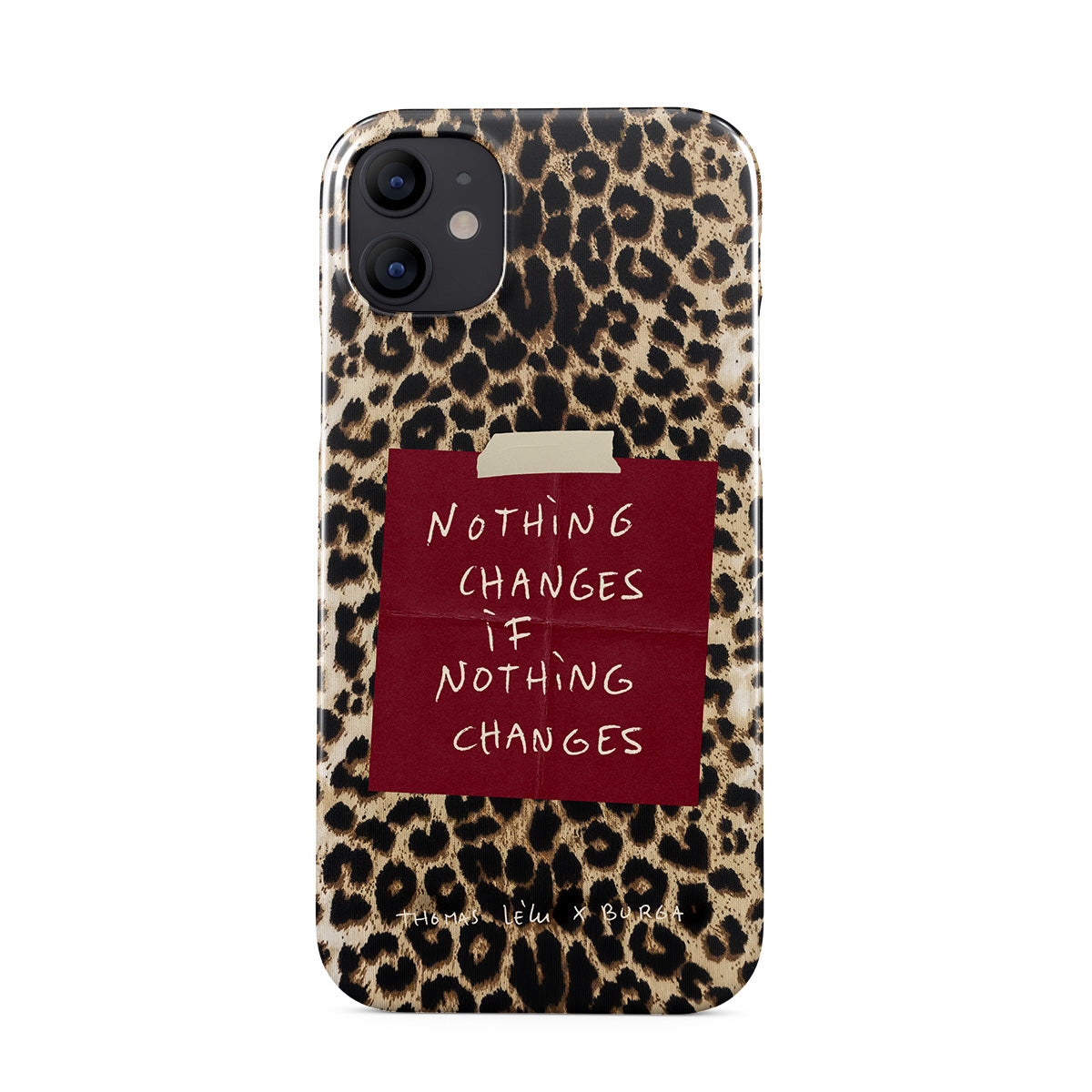 En este diseño: una cita en letra cursiva, una nota adhesiva roja, estampado animal