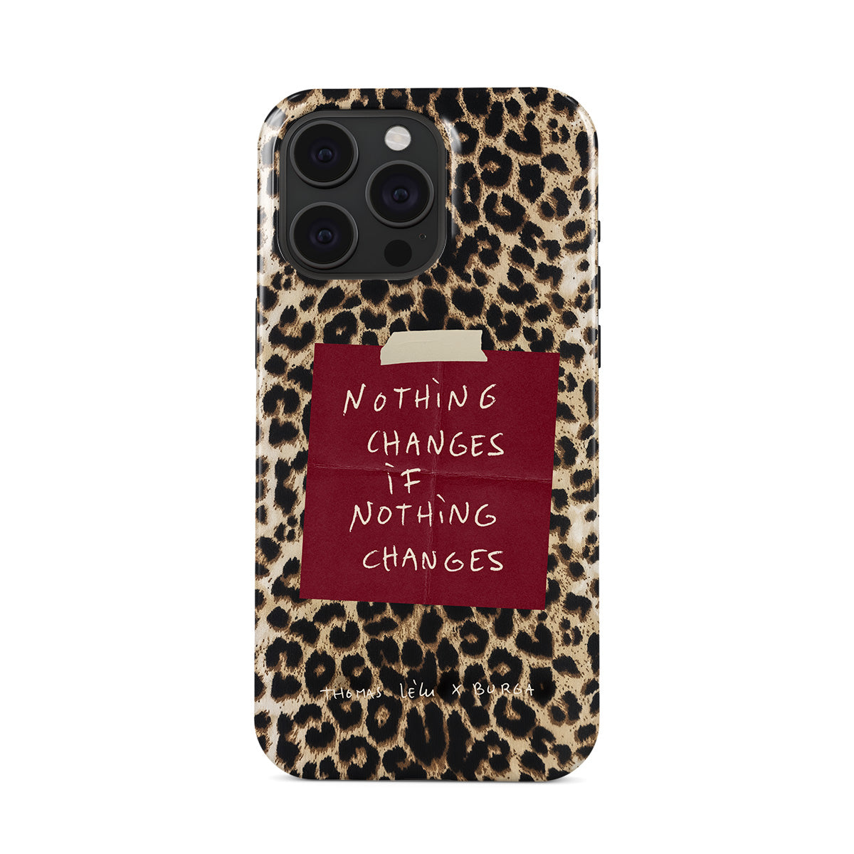 En este diseño: una cita en letra cursiva, una nota adhesiva roja, estampado animal