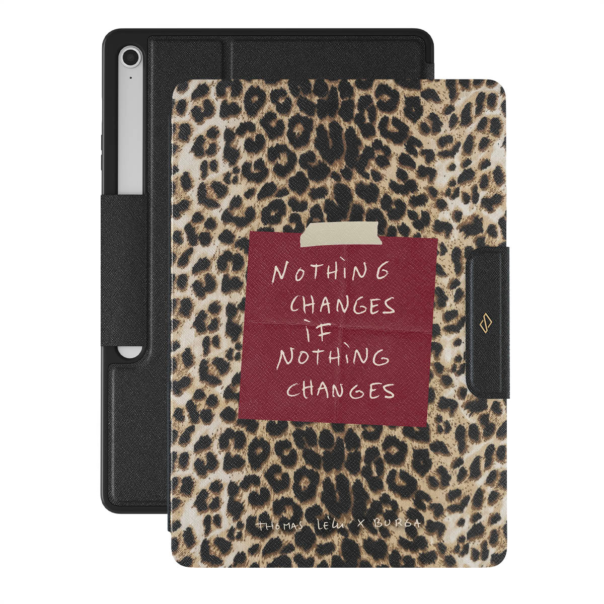 En este diseño: una cita en letra cursiva, una nota adhesiva roja, estampado animal