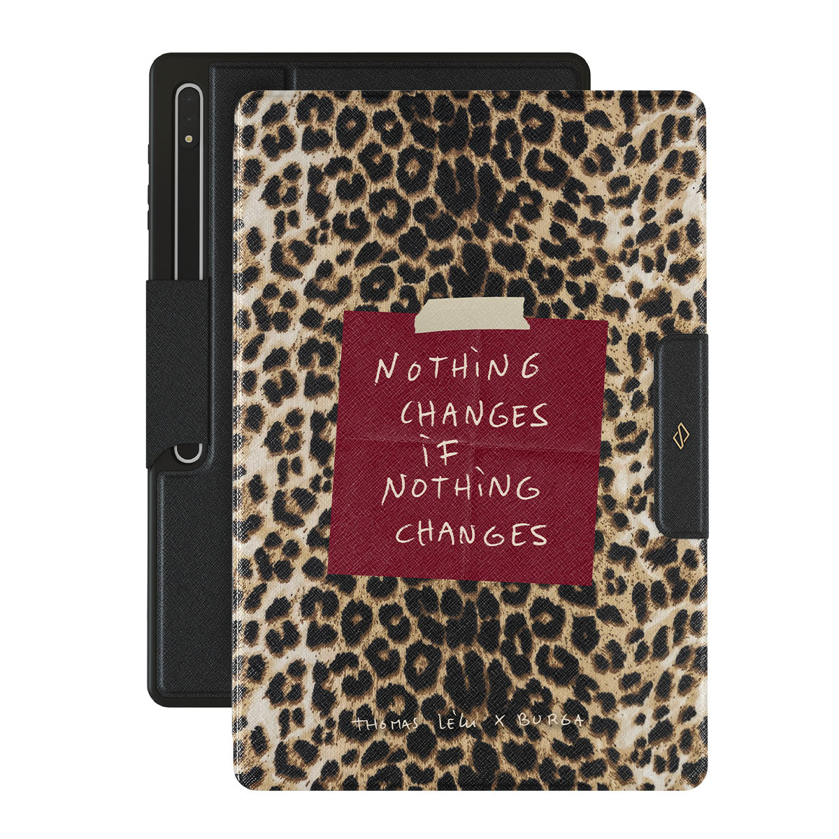 En este diseño: una cita en letra cursiva, una nota adhesiva roja, estampado animal