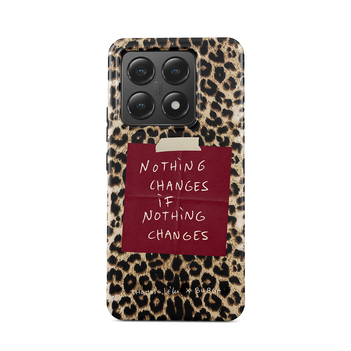 En este diseño: una cita en letra cursiva, una nota adhesiva roja, estampado animal