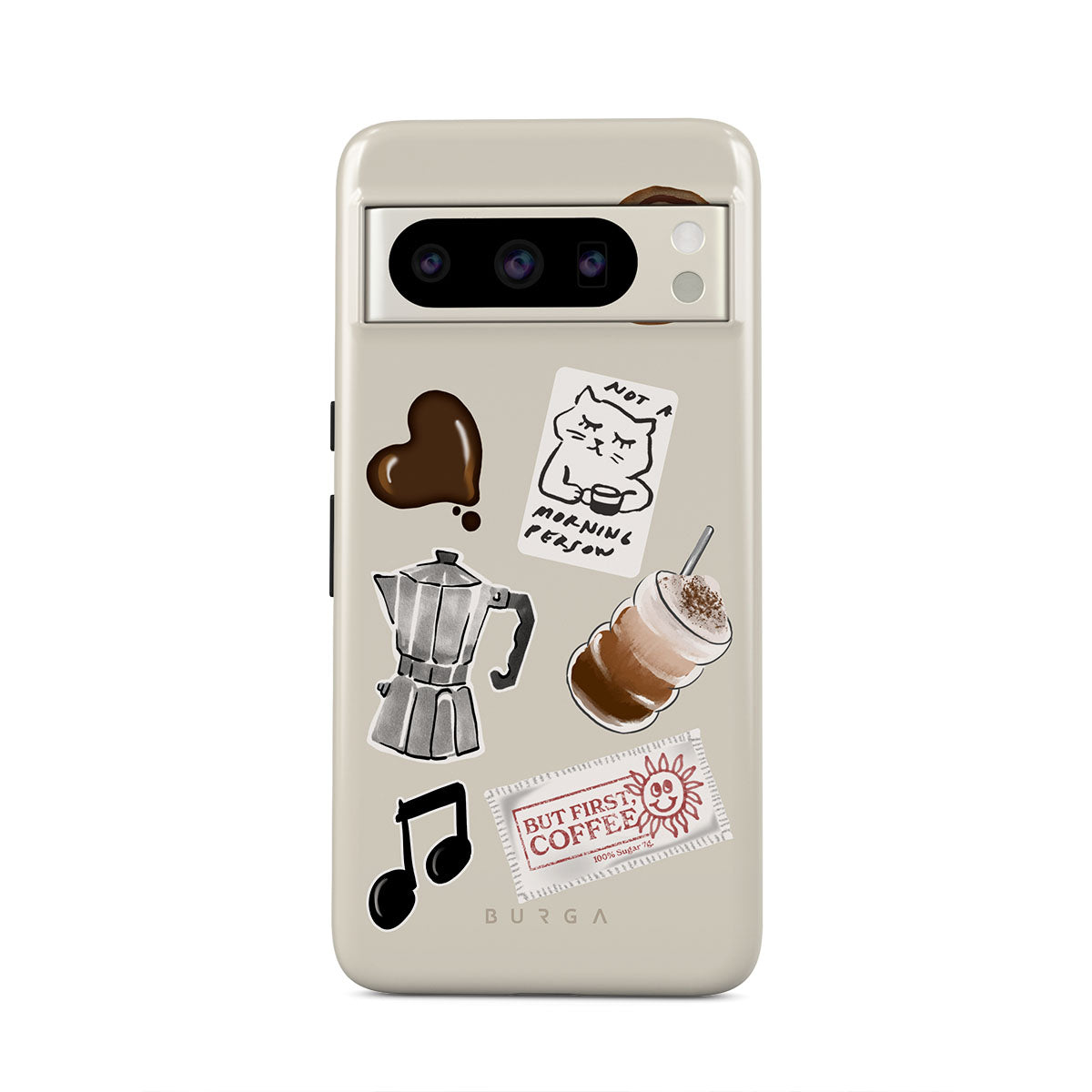 En este diseño: cafetera moka, frappé, rollo de canela, corazón de chocolate, sticker "Not a morning person", ticket "But First, Coffee", nota musical.