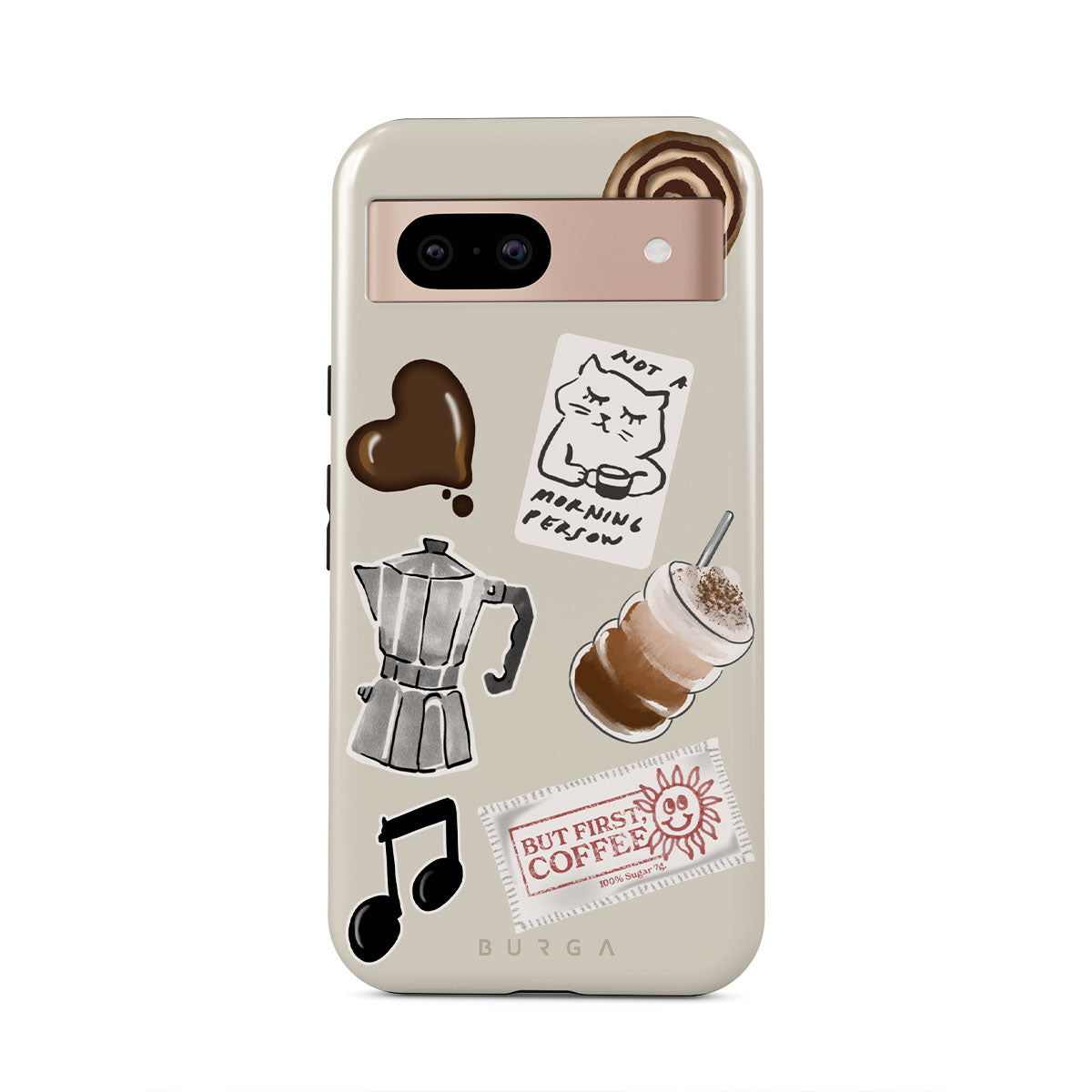 En este diseño: cafetera moka, frappé, rollo de canela, corazón de chocolate, sticker "Not a morning person", ticket "But First, Coffee", nota musical.