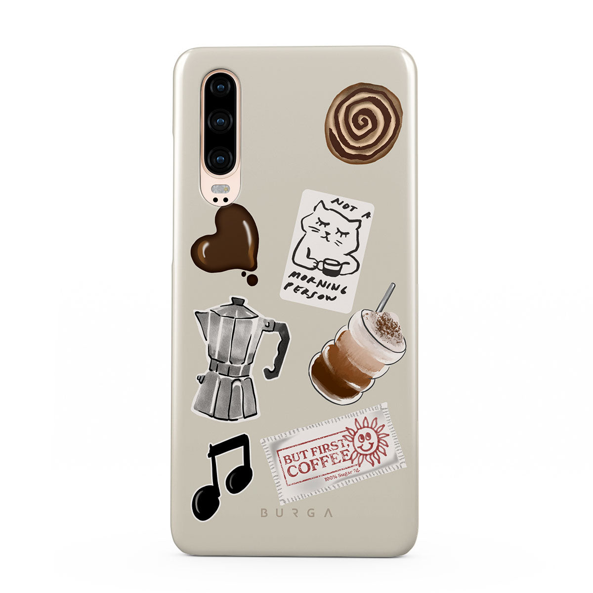 En este diseño: cafetera moka, frappé, rollo de canela, corazón de chocolate, sticker "Not a morning person", ticket "But First, Coffee", nota musical.