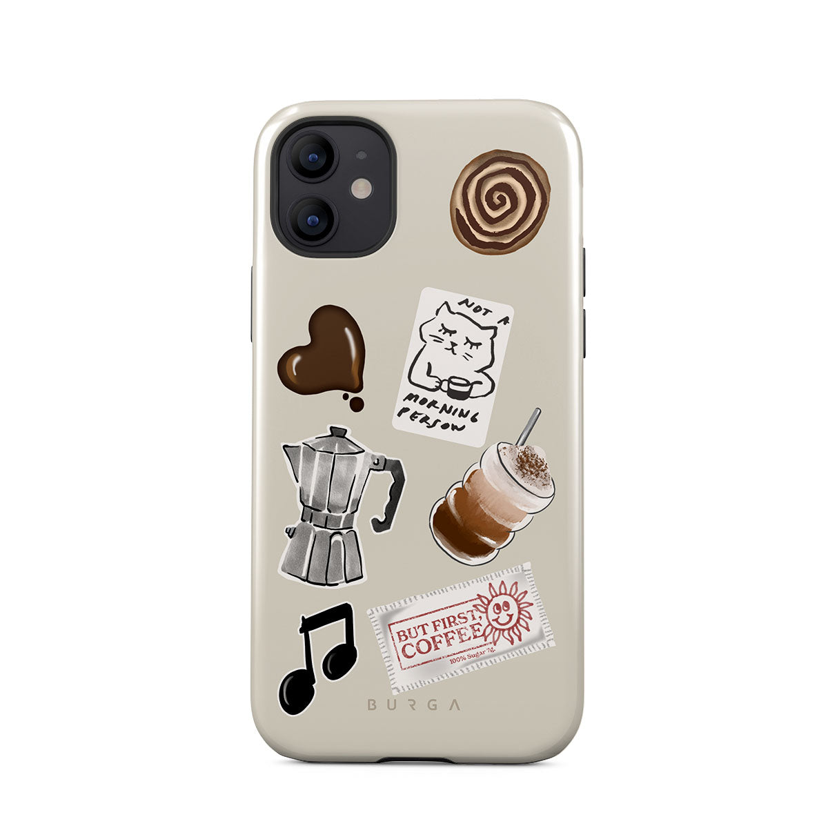 En este diseño: cafetera moka, frappé, rollo de canela, corazón de chocolate, sticker "Not a morning person", ticket "But First, Coffee", nota musical.