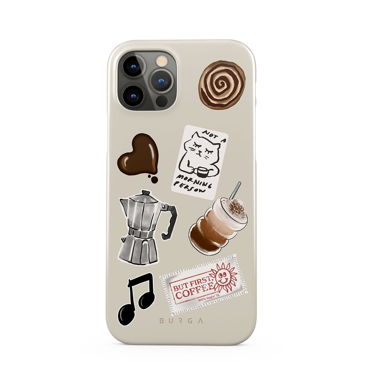En este diseño: cafetera moka, frappé, rollo de canela, corazón de chocolate, sticker "Not a morning person", ticket "But First, Coffee", nota musical.