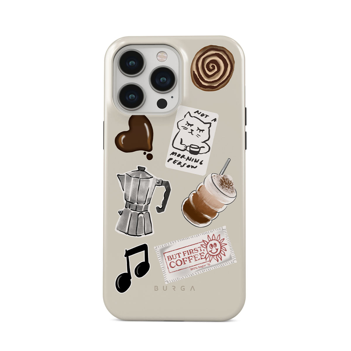 En este diseño: cafetera moka, frappé, rollo de canela, corazón de chocolate, sticker "Not a morning person", ticket "But First, Coffee", nota musical.