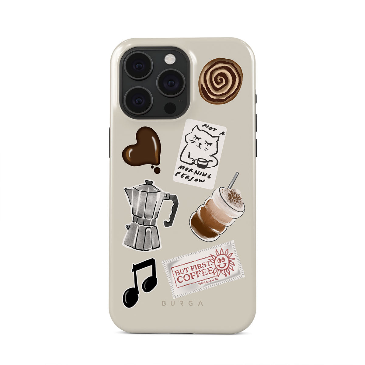 En este diseño: cafetera moka, frappé, rollo de canela, corazón de chocolate, sticker "Not a morning person", ticket "But First, Coffee", nota musical.