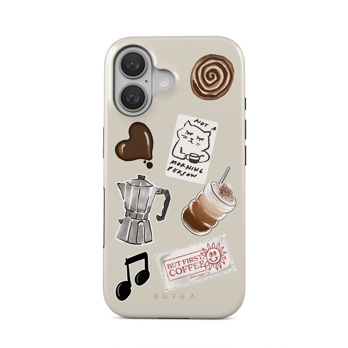 En este diseño: cafetera moka, frappé, rollo de canela, corazón de chocolate, sticker "Not a morning person", ticket "But First, Coffee", nota musical.
