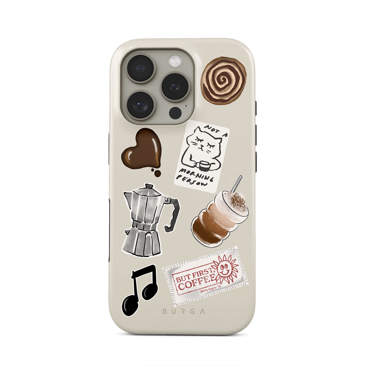 En este diseño: cafetera moka, frappé, rollo de canela, corazón de chocolate, sticker "Not a morning person", ticket "But First, Coffee", nota musical.