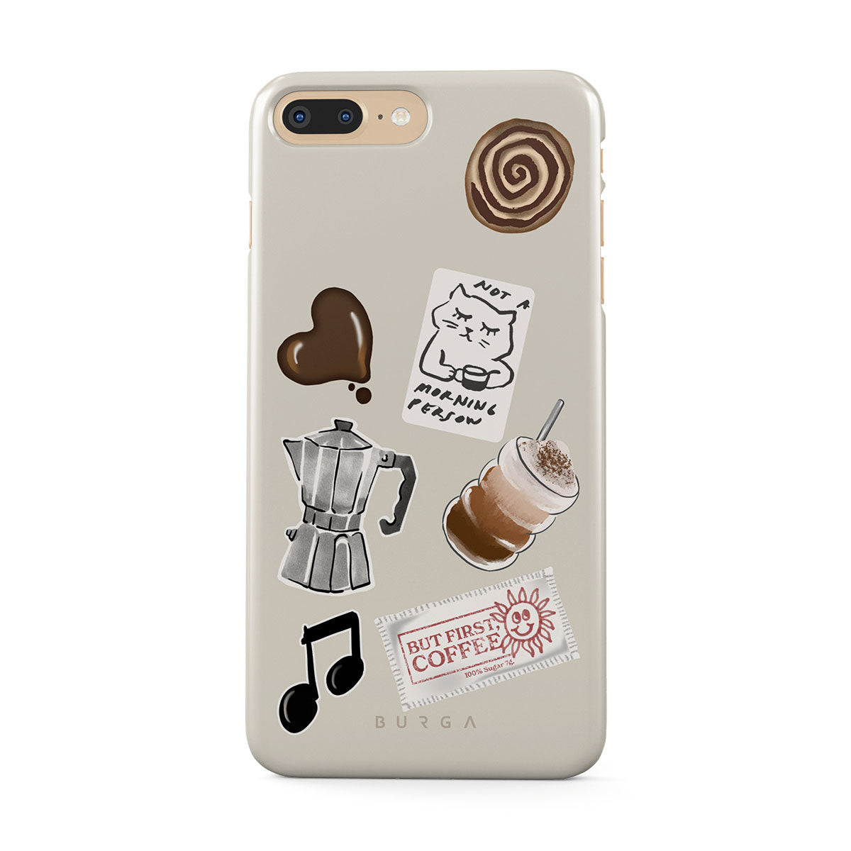 En este diseño: cafetera moka, frappé, rollo de canela, corazón de chocolate, sticker "Not a morning person", ticket "But First, Coffee", nota musical.