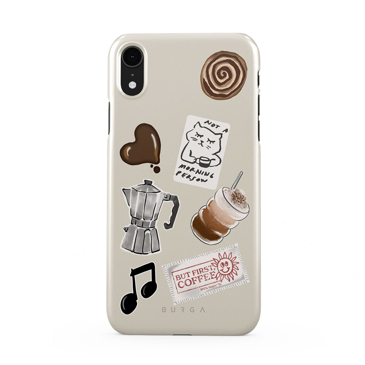En este diseño: cafetera moka, frappé, rollo de canela, corazón de chocolate, sticker "Not a morning person", ticket "But First, Coffee", nota musical.