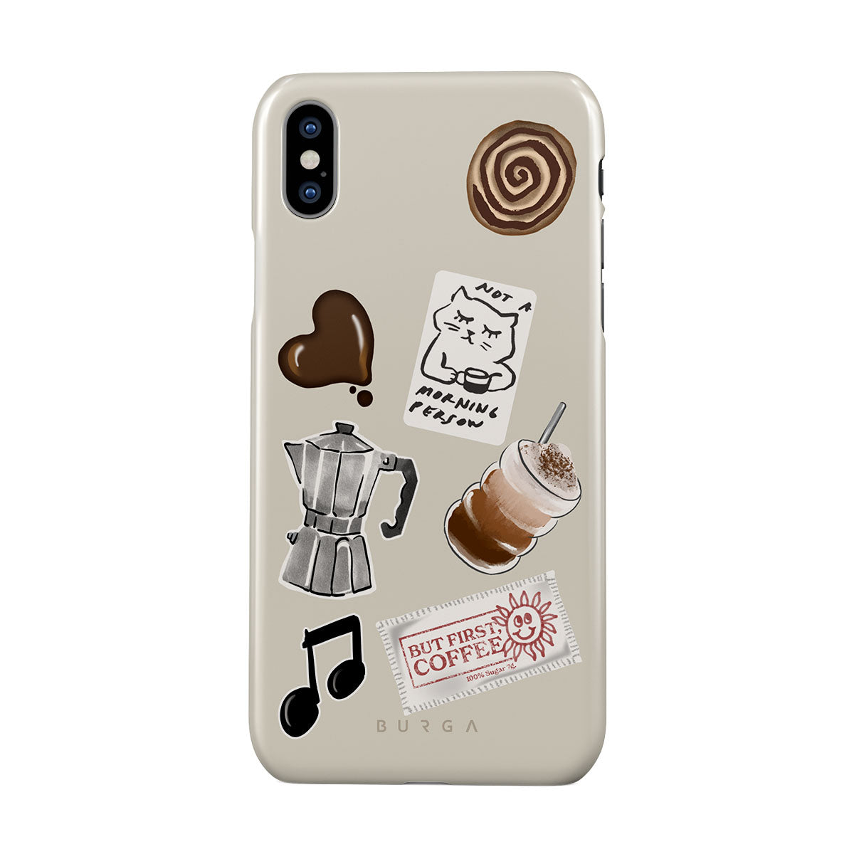 En este diseño: cafetera moka, frappé, rollo de canela, corazón de chocolate, sticker "Not a morning person", ticket "But First, Coffee", nota musical.