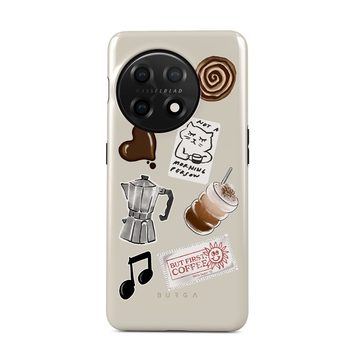 En este diseño: cafetera moka, frappé, rollo de canela, corazón de chocolate, sticker "Not a morning person", ticket "But First, Coffee", nota musical.