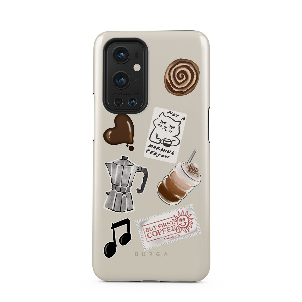 En este diseño: cafetera moka, frappé, rollo de canela, corazón de chocolate, sticker "Not a morning person", ticket "But First, Coffee", nota musical.