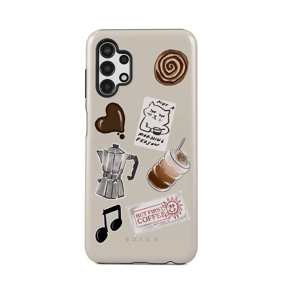 En este diseño: cafetera moka, frappé, rollo de canela, corazón de chocolate, sticker "Not a morning person", ticket "But First, Coffee", nota musical.