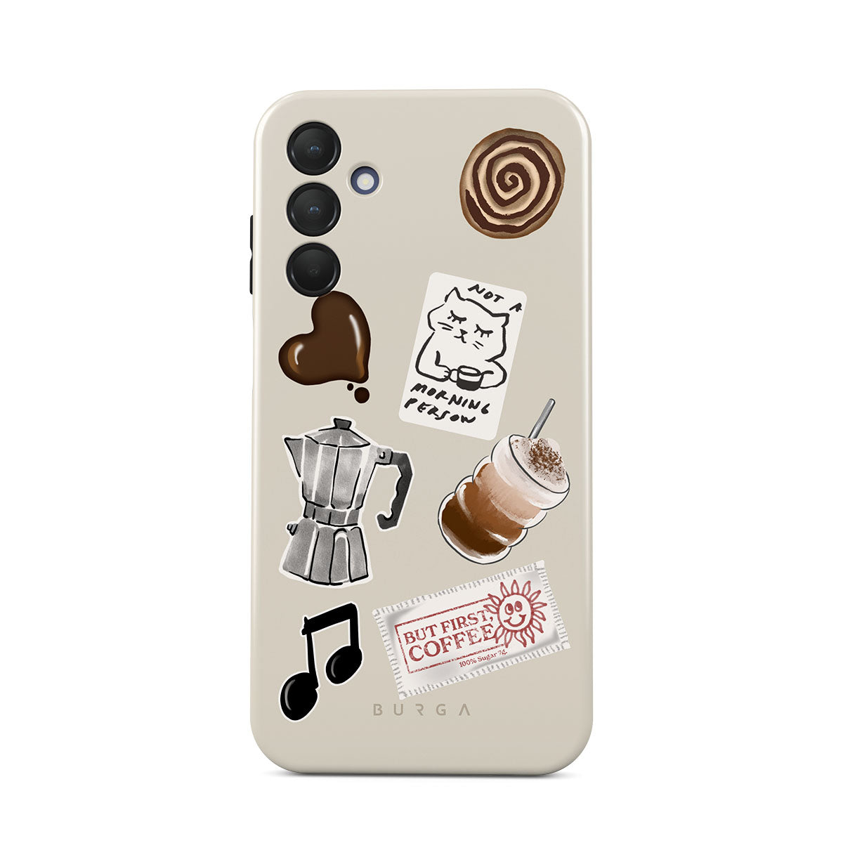 En este diseño: cafetera moka, frappé, rollo de canela, corazón de chocolate, sticker "Not a morning person", ticket "But First, Coffee", nota musical.