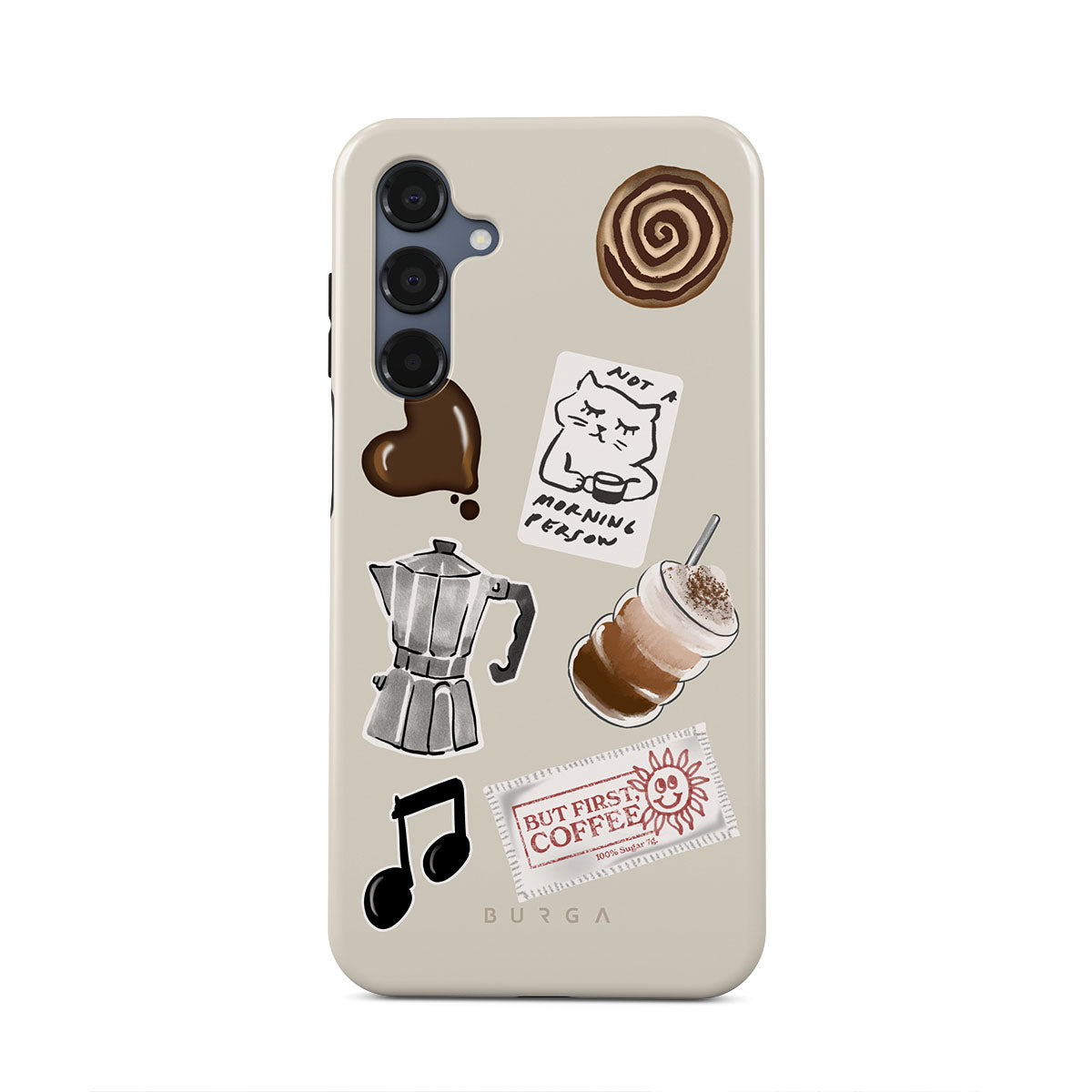En este diseño: cafetera moka, frappé, rollo de canela, corazón de chocolate, sticker "Not a morning person", ticket "But First, Coffee", nota musical.