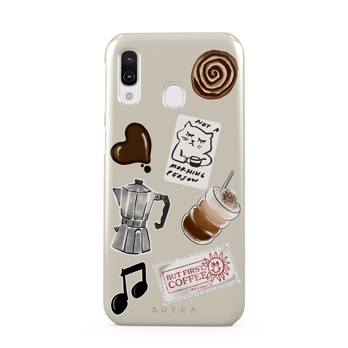 En este diseño: cafetera moka, frappé, rollo de canela, corazón de chocolate, sticker "Not a morning person", ticket "But First, Coffee", nota musical.