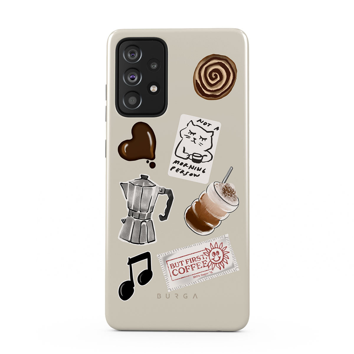 En este diseño: cafetera moka, frappé, rollo de canela, corazón de chocolate, sticker "Not a morning person", ticket "But First, Coffee", nota musical.
