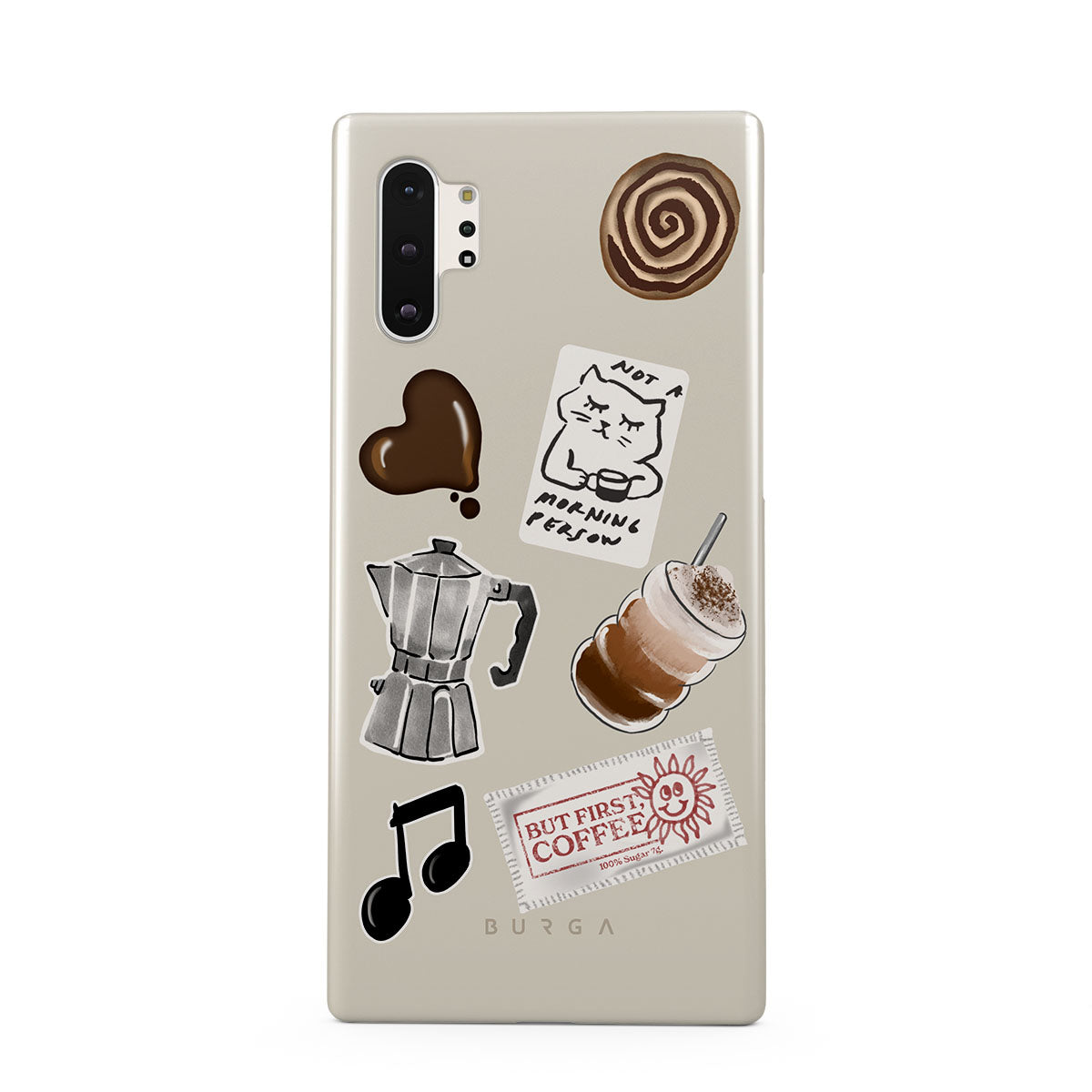 En este diseño: cafetera moka, frappé, rollo de canela, corazón de chocolate, sticker "Not a morning person", ticket "But First, Coffee", nota musical.