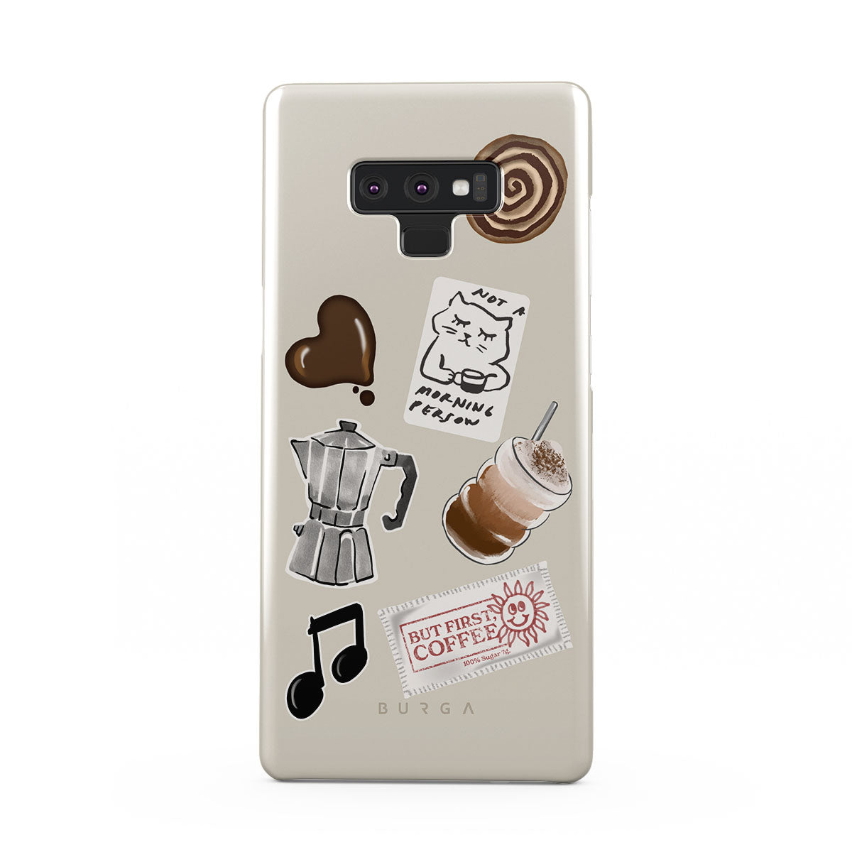 En este diseño: cafetera moka, frappé, rollo de canela, corazón de chocolate, sticker "Not a morning person", ticket "But First, Coffee", nota musical.