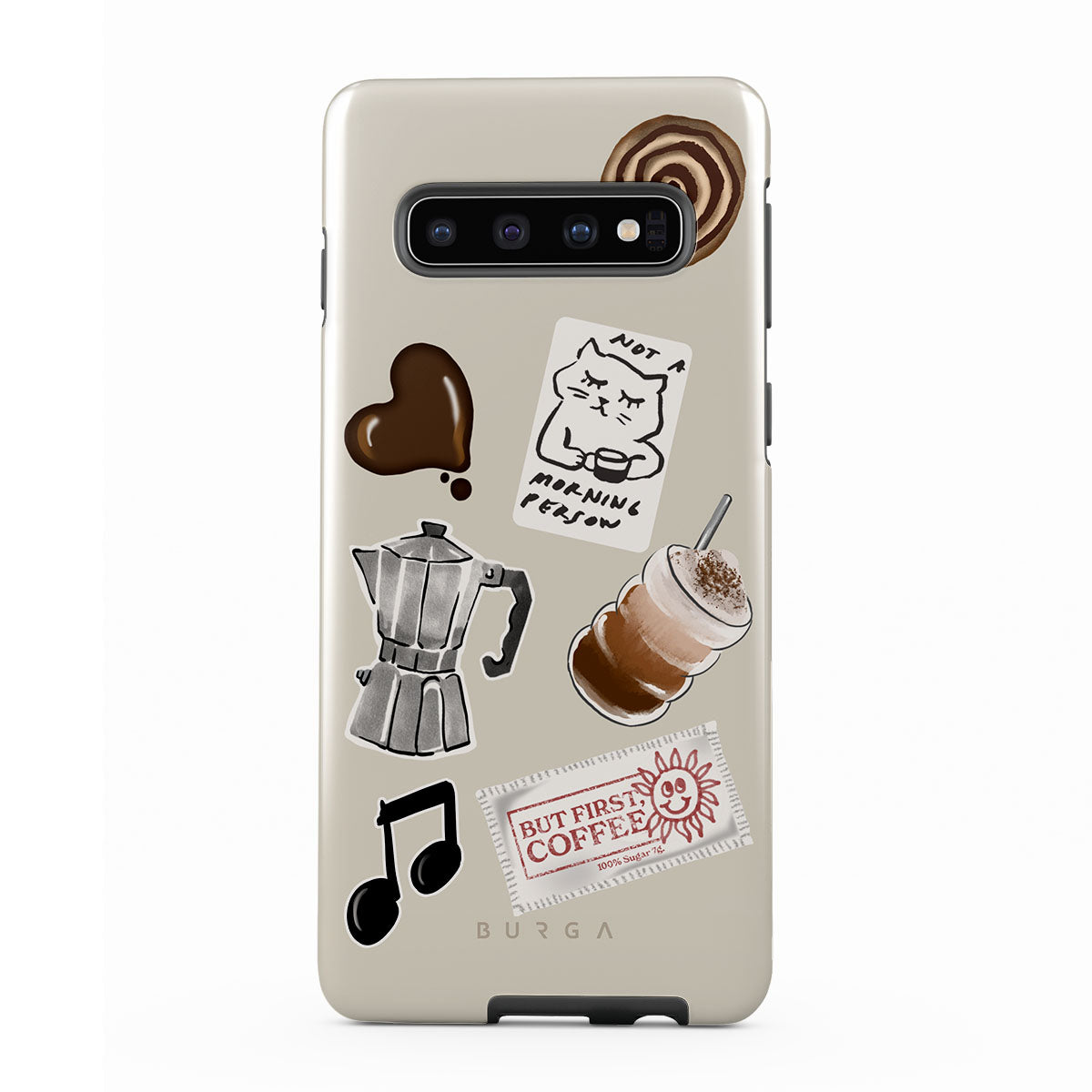 En este diseño: cafetera moka, frappé, rollo de canela, corazón de chocolate, sticker "Not a morning person", ticket "But First, Coffee", nota musical.