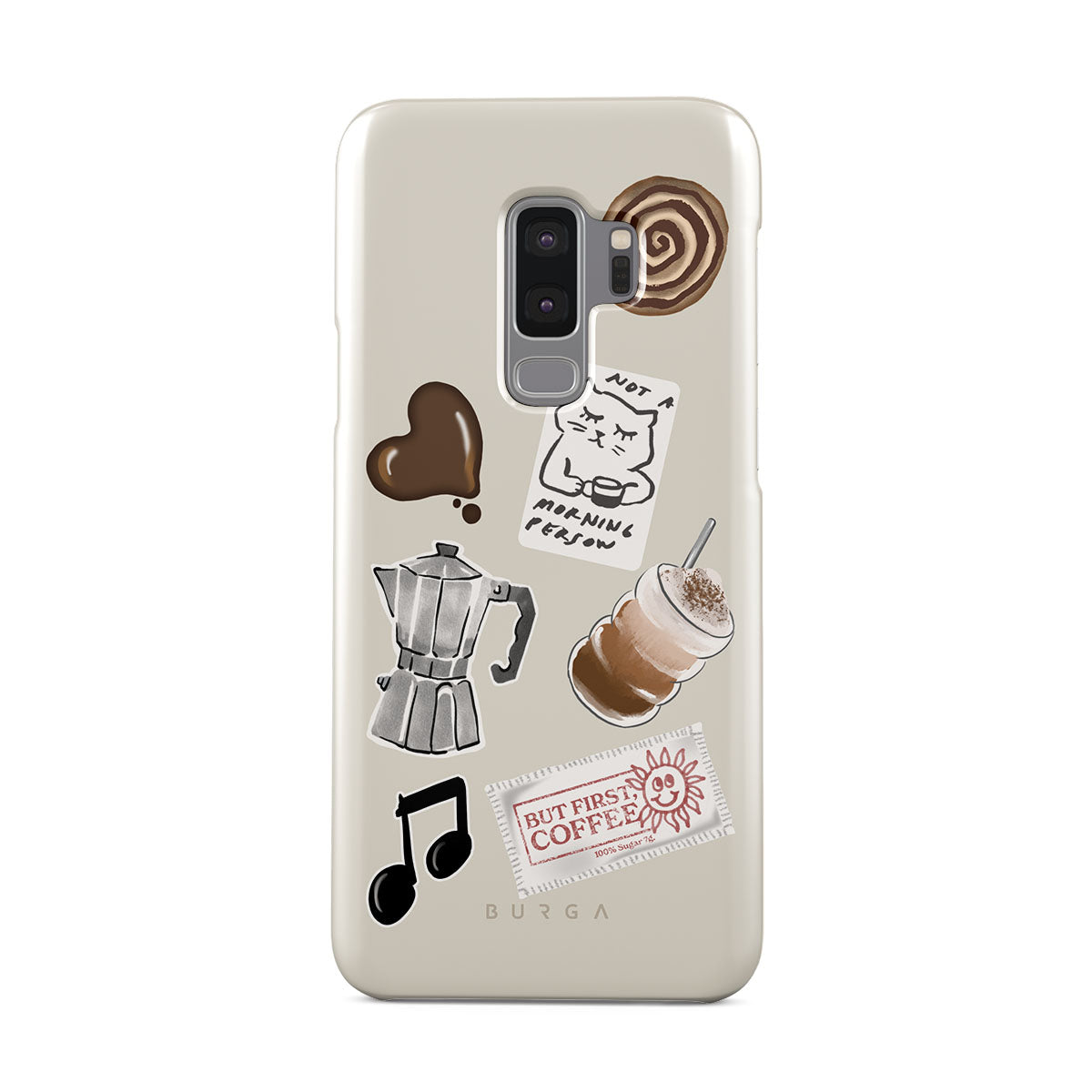 En este diseño: cafetera moka, frappé, rollo de canela, corazón de chocolate, sticker "Not a morning person", ticket "But First, Coffee", nota musical.