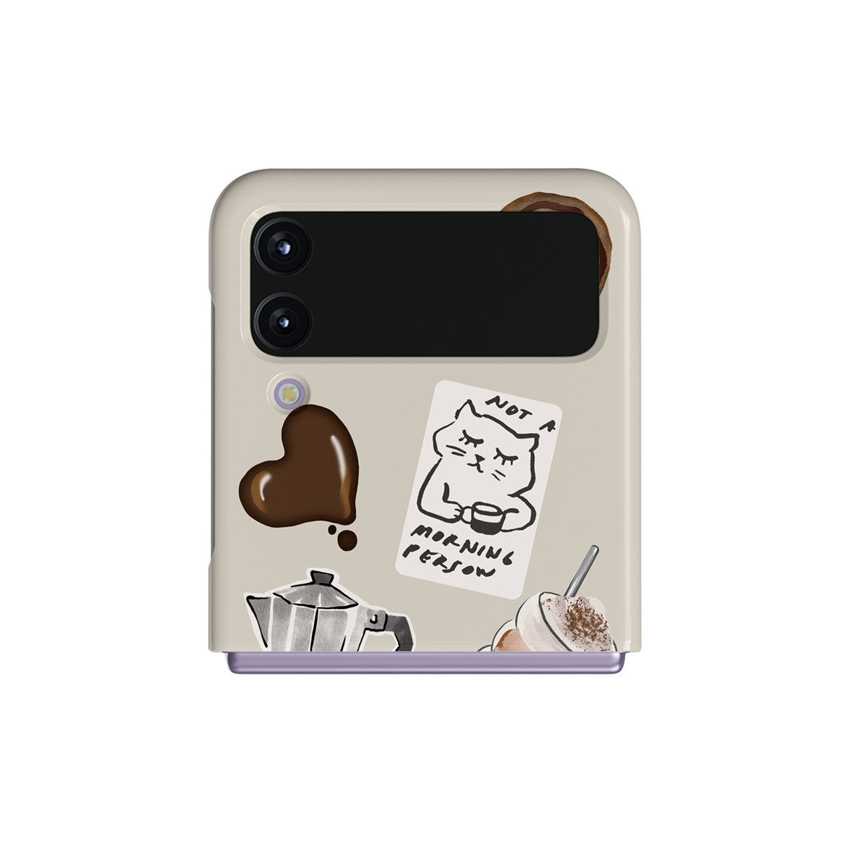En este diseño: cafetera moka, frappé, rollo de canela, corazón de chocolate, sticker "Not a morning person", ticket "But First, Coffee", nota musical.