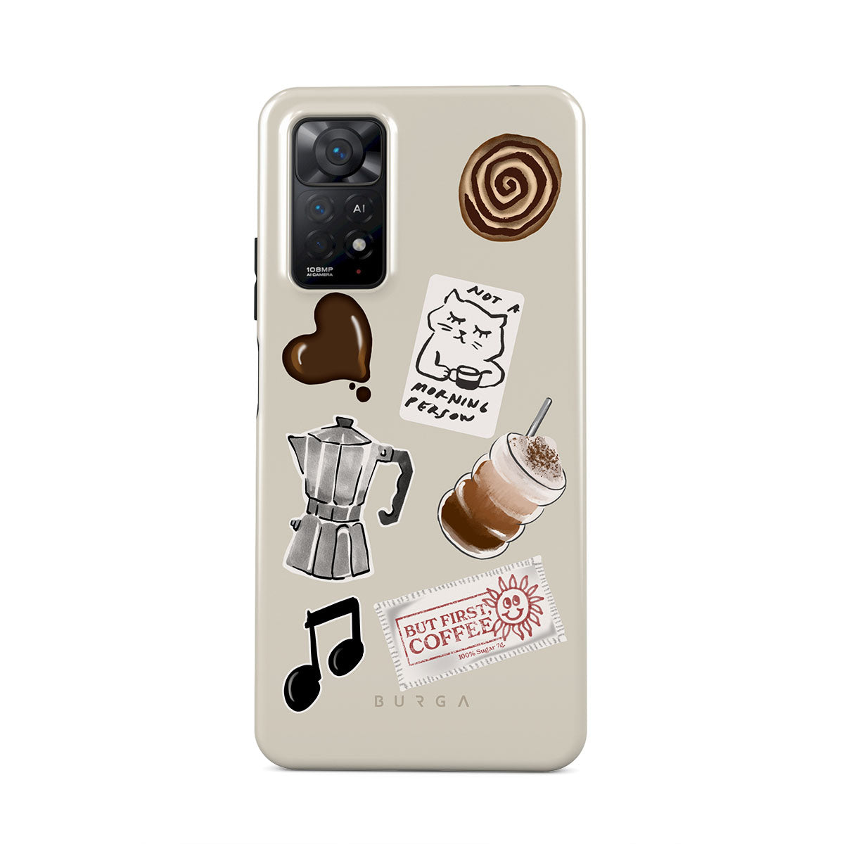 En este diseño: cafetera moka, frappé, rollo de canela, corazón de chocolate, sticker "Not a morning person", ticket "But First, Coffee", nota musical.
