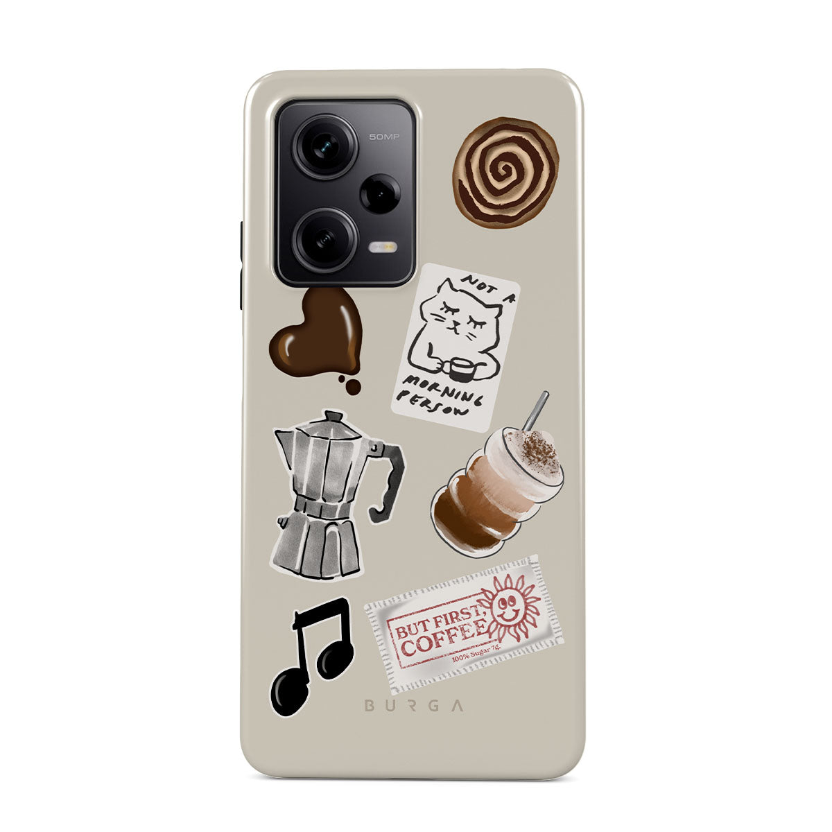 En este diseño: cafetera moka, frappé, rollo de canela, corazón de chocolate, sticker "Not a morning person", ticket "But First, Coffee", nota musical.