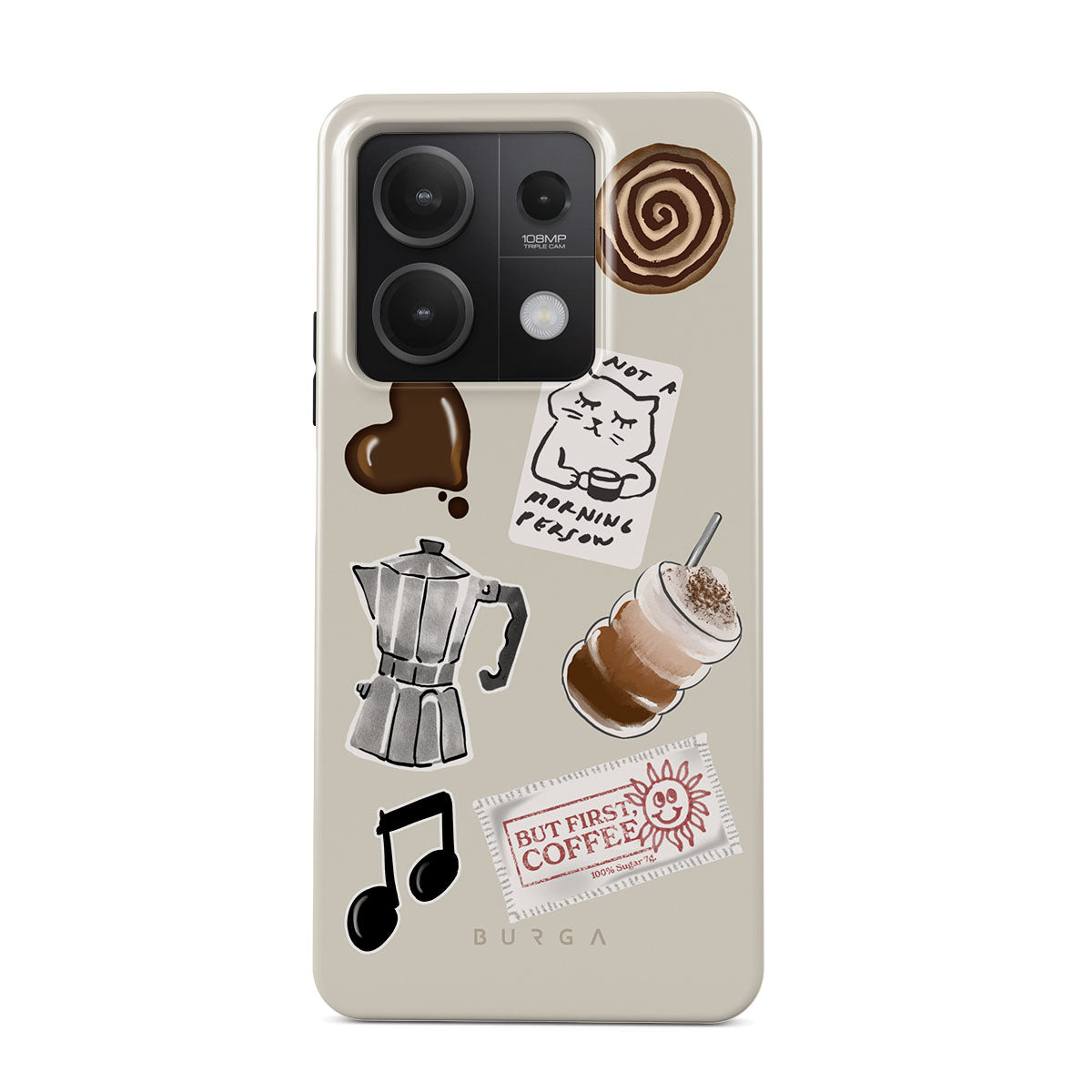 En este diseño: cafetera moka, frappé, rollo de canela, corazón de chocolate, sticker "Not a morning person", ticket "But First, Coffee", nota musical.